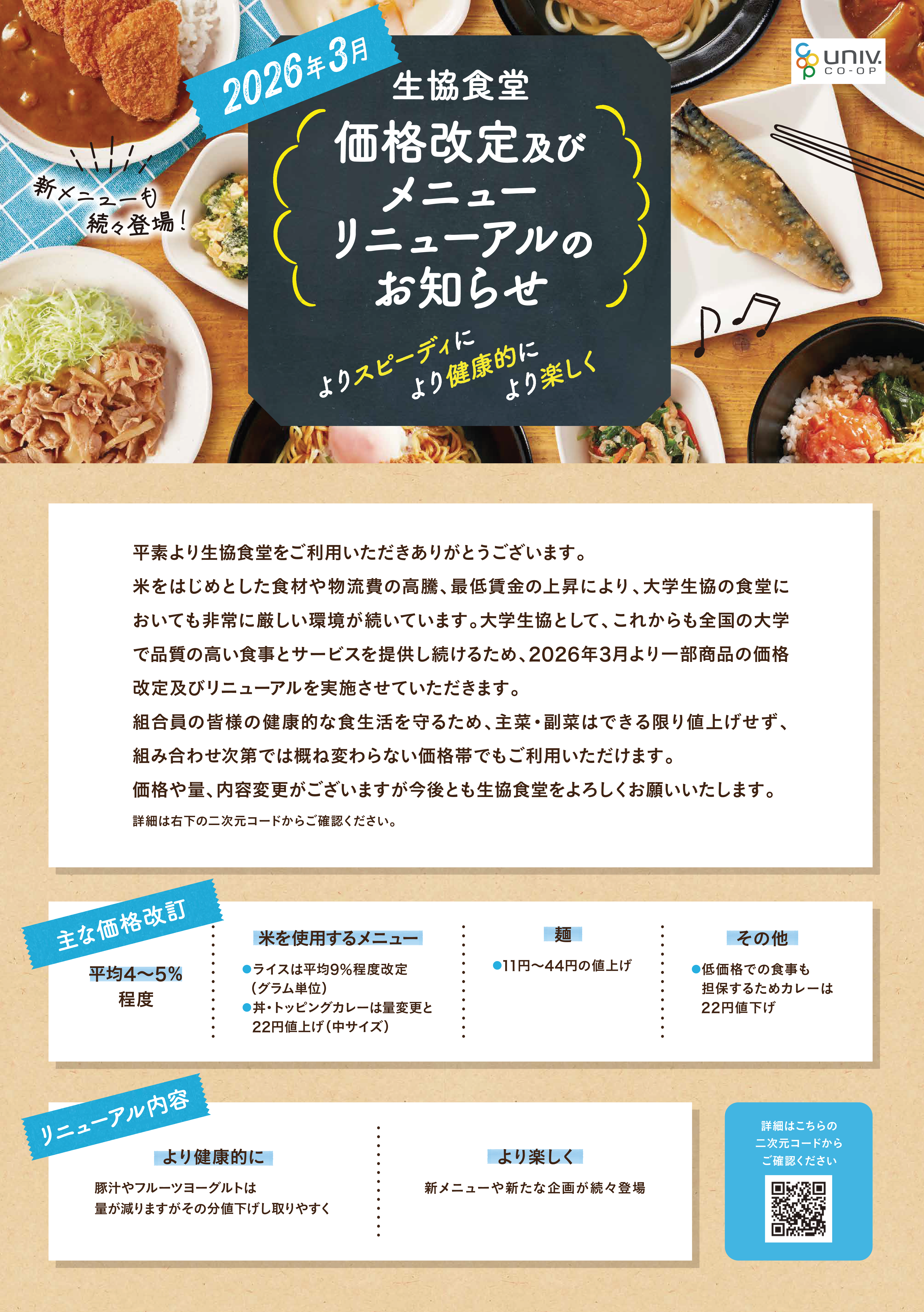そのため、大学生協では2026年3月より食堂メニュー・手作り弁当の一部価格改定ならびに量目(内容)を変更せざるを得ないと判断致しました。